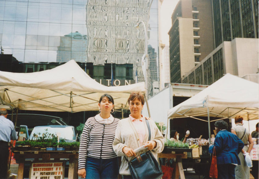 The photo was taken in 1997. There was a street market in front of the WTC, and you can see one tower in the reflect of the building.