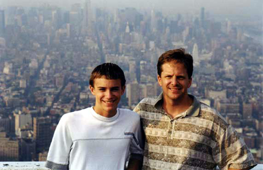 My son Jared and I are shown here on the observation deck of the World Trade Center. Our backs are facing „Uptown“ toward the Empire State Building and Central Park. The two of us were in NYC celebrating his 13th Birthday in August 2001, just weeks before the towers became a thing of the past.