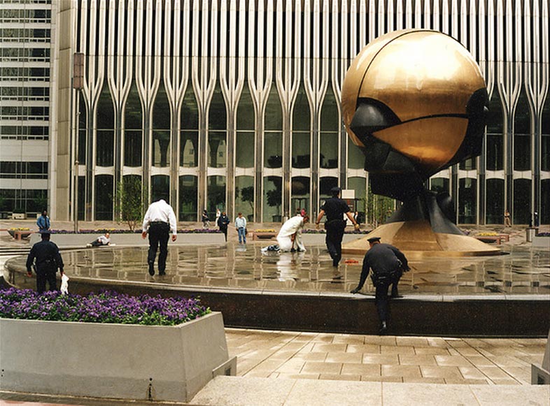 When we got back to street level and were crossing the plaza in the centre we began to hear a woman shouting. As we watched a woman clad in a blanket climbed onto the fountain by the golden ball, dropped the blanket to reveal she was totally naked and began reaching for the sky and yelling. Being the centre of NY it didn’t take more than couple of minutes for a bunch of policeman to gather, don gloves and remove the woman.