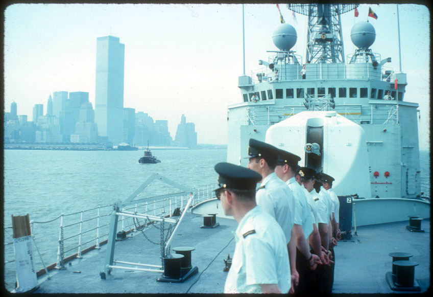 This is the forecastle crew of HMCS Iroquois looking at Lower Manhattan, with the backlit World Trade Center towers in the background, on July 3, 1976. Regrettably, I have no names but they are men from a variety of trades who work on the upper deck when the ship is entering or leaving harbor or conducting other seamanship evolutions. Their generic term is ’seamen.‘ PO2 Peter Magwood Photo