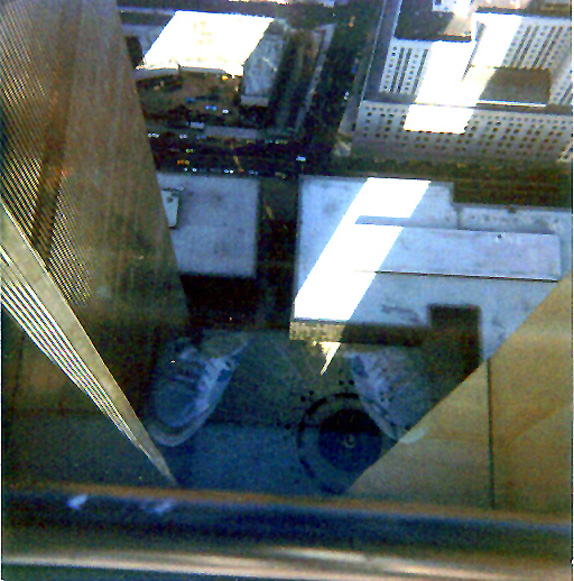 This was October, 1983 looking at Austin Tobin Plaza and the Globe Sculpture between One and Two World Trade. My blue and white sneakers are reflected in the glass.