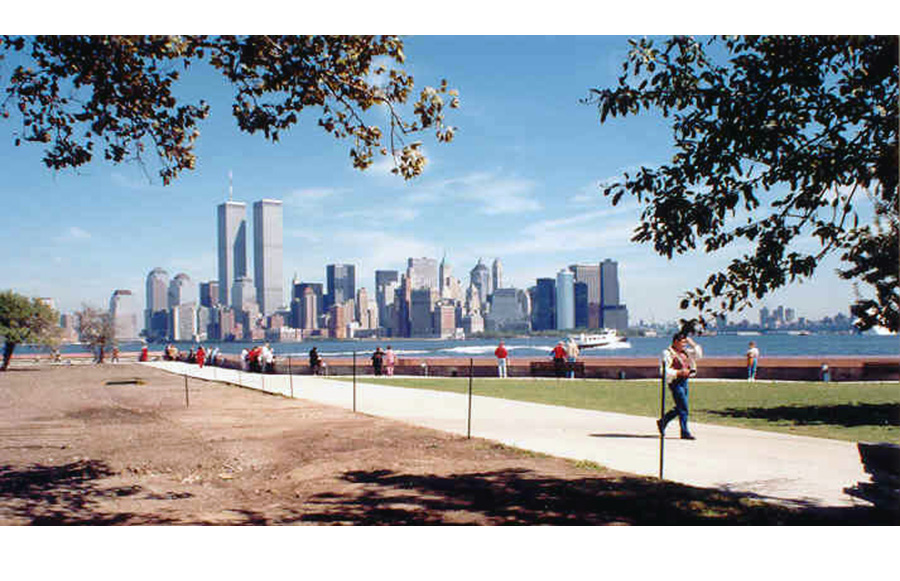 My visit was on 24 September 1990 and I made a rubbing of pop’s inscribed name. At the time I also took this picture of Manhattan from Ellis Island, looking north. Note the ‚Wall of Honor‘ and the World Trade Center; my wife and I had lunch on the 104 floor and visited the observation deck that morning.