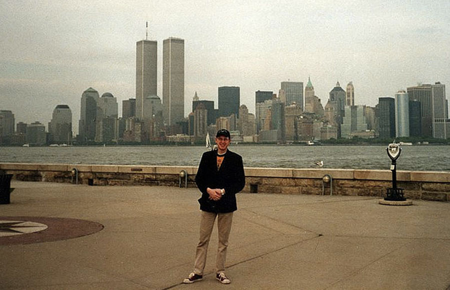 I can tell you a little bit about the photo. Firstly, I am from Somerset in England. I travelled to New York City in May 2001 for a holiday. This image was taken from Liberty Island with me in front of the iconic Manhattan skyline which of course then included the WTC. The day before this image was taken I visited the top of the WTC and was in awe at the fantastic view afforded from such a height. It was the hiughlight of my visit. I can see that I am wearing the football shirt of my favourite team, Bristol City.