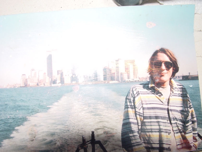 1994, on the ferry to Staten Island. on a school trip to see the arts, we were all just 21 or almost, so decided to get out of the humid city and to get some a better view of the city from the ferry. On the night of 9-11 I looked for this picture and took this photo of it, the flash made the towers invisible..,